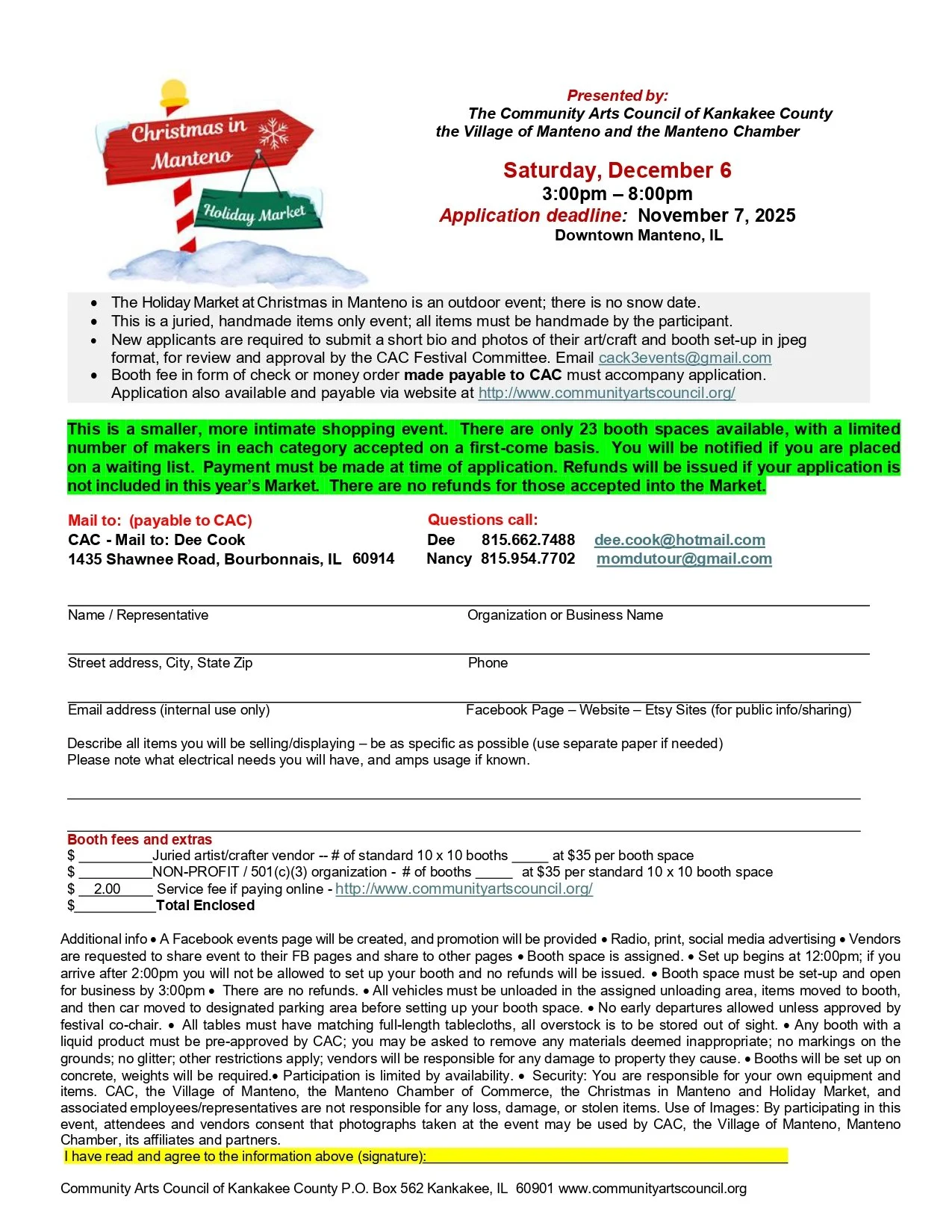 This is a smaller, more intimate shopping event. There are only 23 booth spaces available, withalimitednumber of makers in each category accepted on a first-come basis. You will be notifiedif youareplacedon a waiting list. Payment must be made at time of application. Refunds will be issued if your applicationisnot included in this year’s Market. There are no refunds for those accepted into the Market.